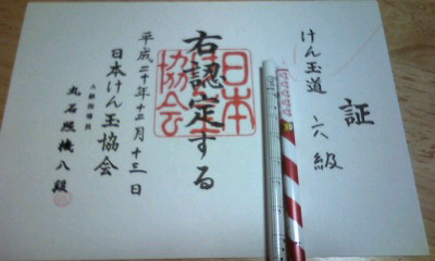 テレビにも出たりしてる人らしいんだけど、その場でけん玉検定試験してくれてたので、子供に混じって参加してみた。大皿・中皿・小皿とかに乗せるのを10回中3回成功すれば、1コ級が上がる。今日はけん玉のけん先に3回入れられなくて、結果「けん玉道六級」いただきました。ちょっと買って練習したくなったわ。
